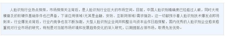 人臉識別行業(yè)熱點頻頻,市場頻頻關(guān)注背后,是人臉識別行業(yè)巨大的市場空間。目前,中國人臉識別精確度已經(jīng)超過人眼,同時大規(guī)模普及的軟硬件基礎(chǔ)條件也已具備,下游應(yīng)用領(lǐng)域(尤其是金融、安防、互聯(lián)網(wǎng)領(lǐng)域)需求強勁。這一切都預(yù)示著人臉識別技術(shù)爆發(fā)點即將到來。行業(yè)爆發(fā)點背后,行業(yè)內(nèi)競爭也在不斷加劇,大型人臉識別企業(yè)間并購整合與資本運作日趨頻繁,國內(nèi)優(yōu)秀的人臉識別企業(yè)愈來愈重視對行業(yè)市場的研究,特別是對當(dāng)前市場環(huán)境和發(fā)展趨勢變化的深入研究,以期提前占領(lǐng)市場,取得先發(fā)優(yōu)勢。